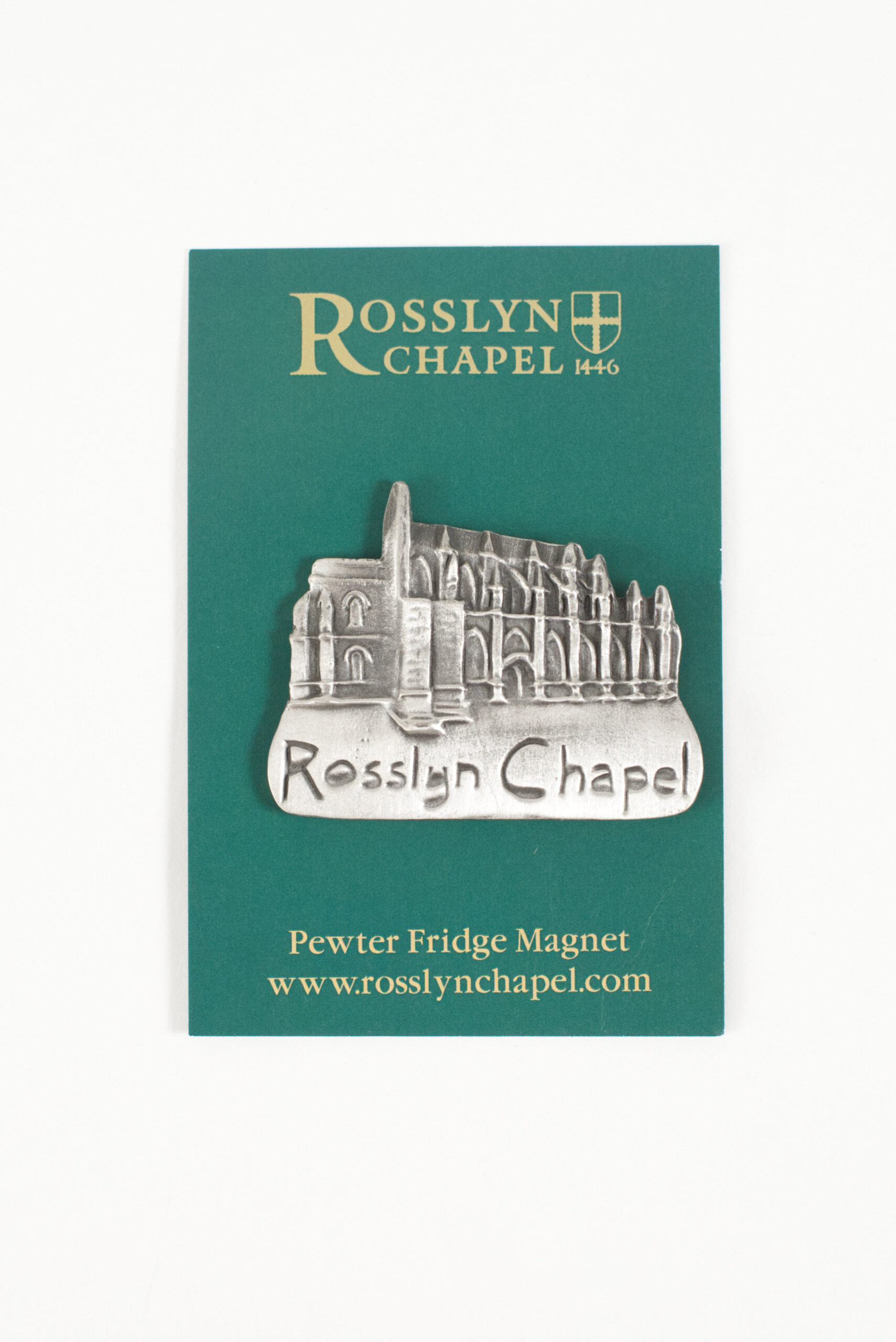 A pewter magnet in the shape of Rosslyn Chapel. Exclusively designed for us by David Hinwood.